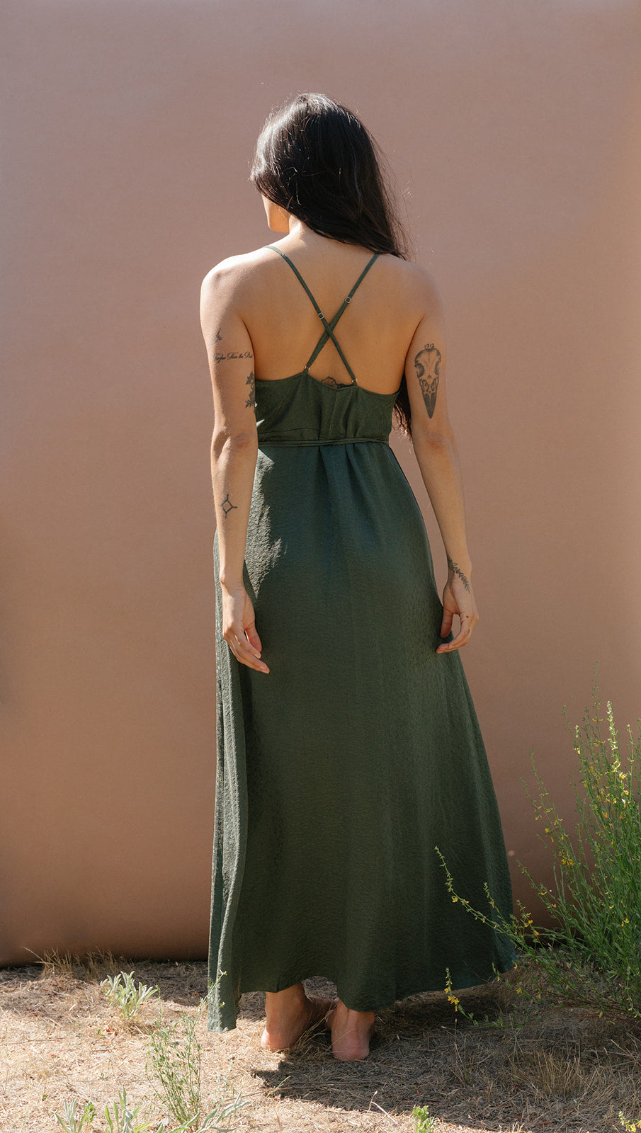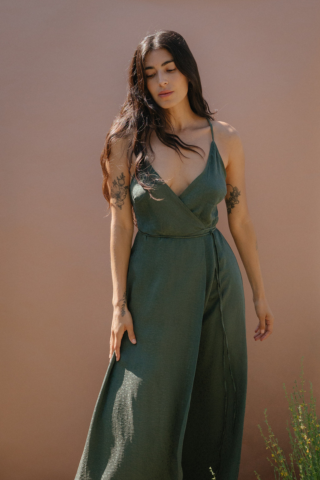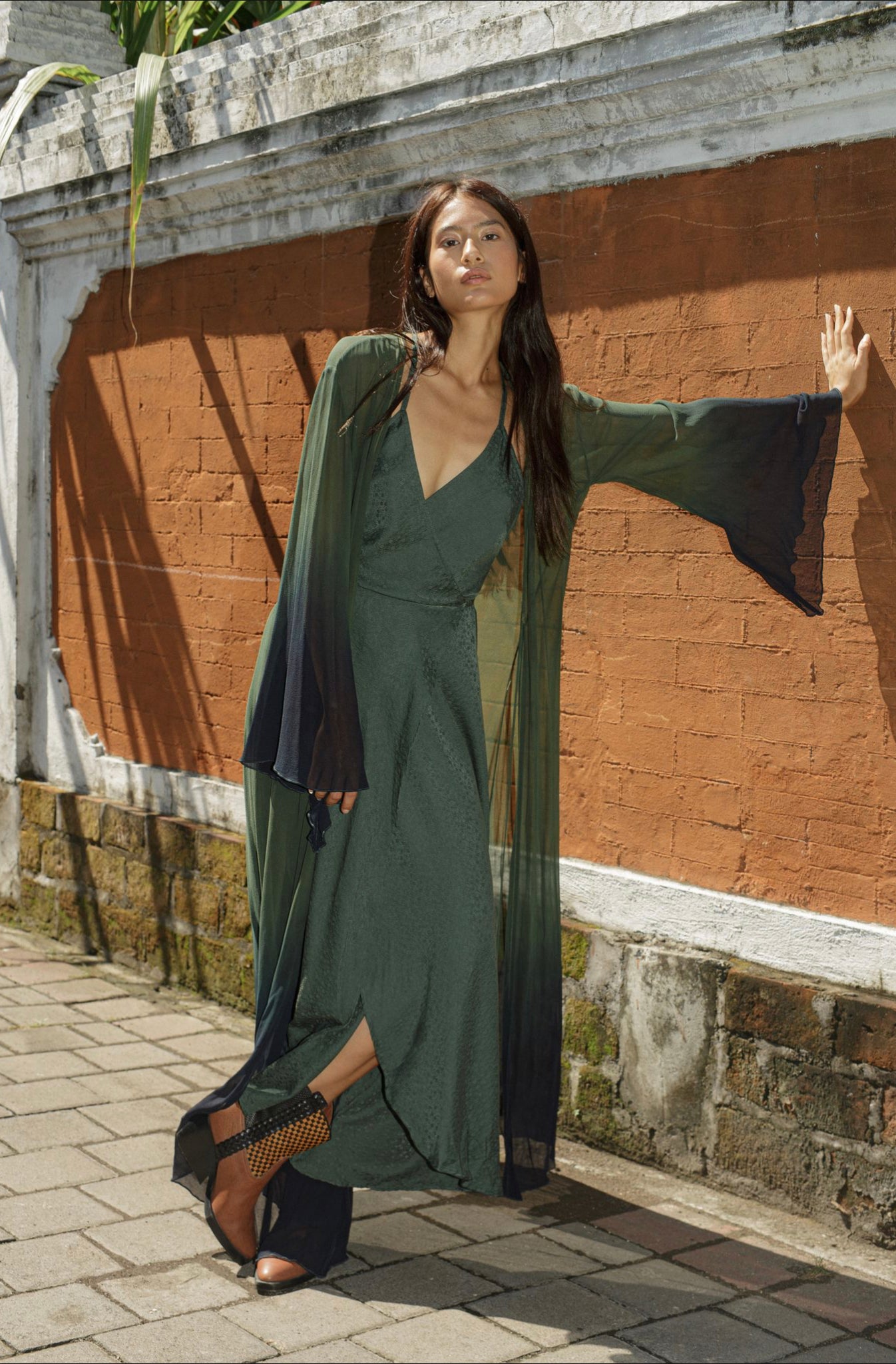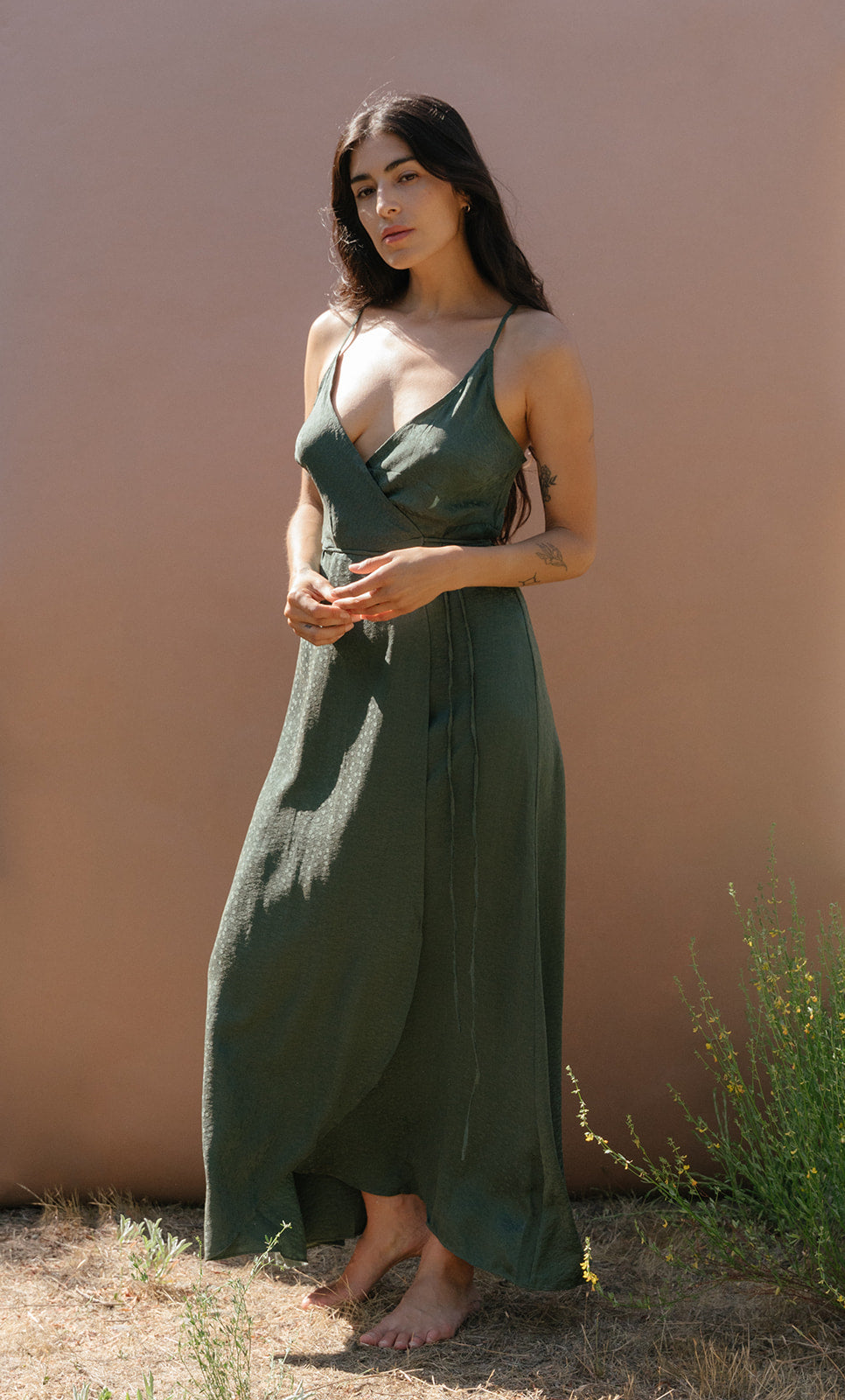 Our Wrap String dress is one of our favorite items. This season is offered in a Jade Green Jacquard Silk Satin. We reworked this piece so it's fitting true to size from this season onward.