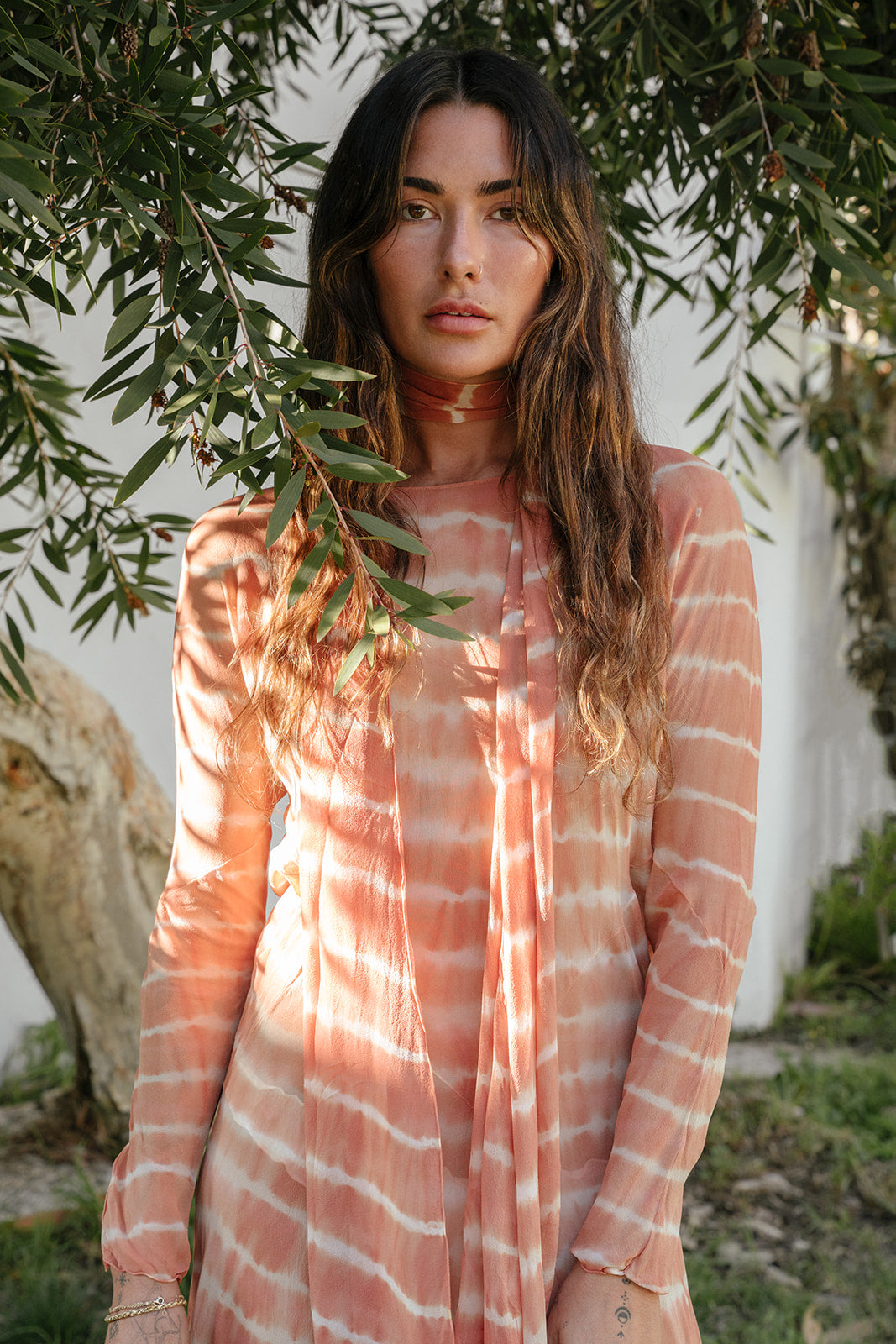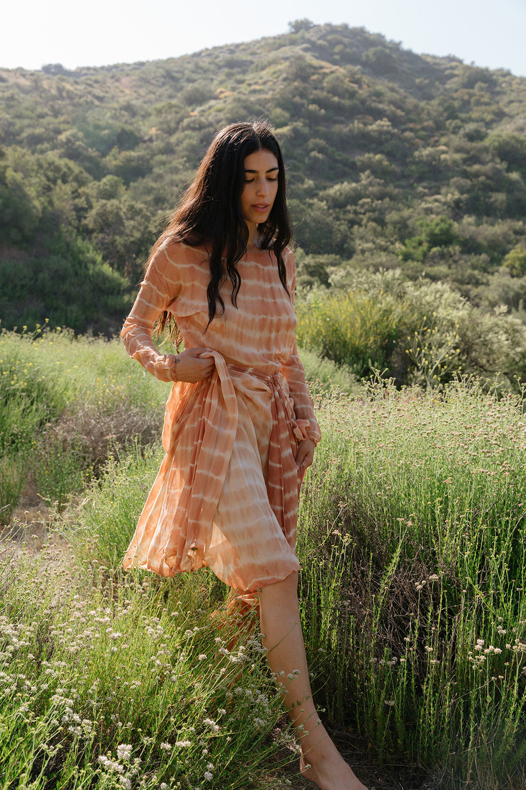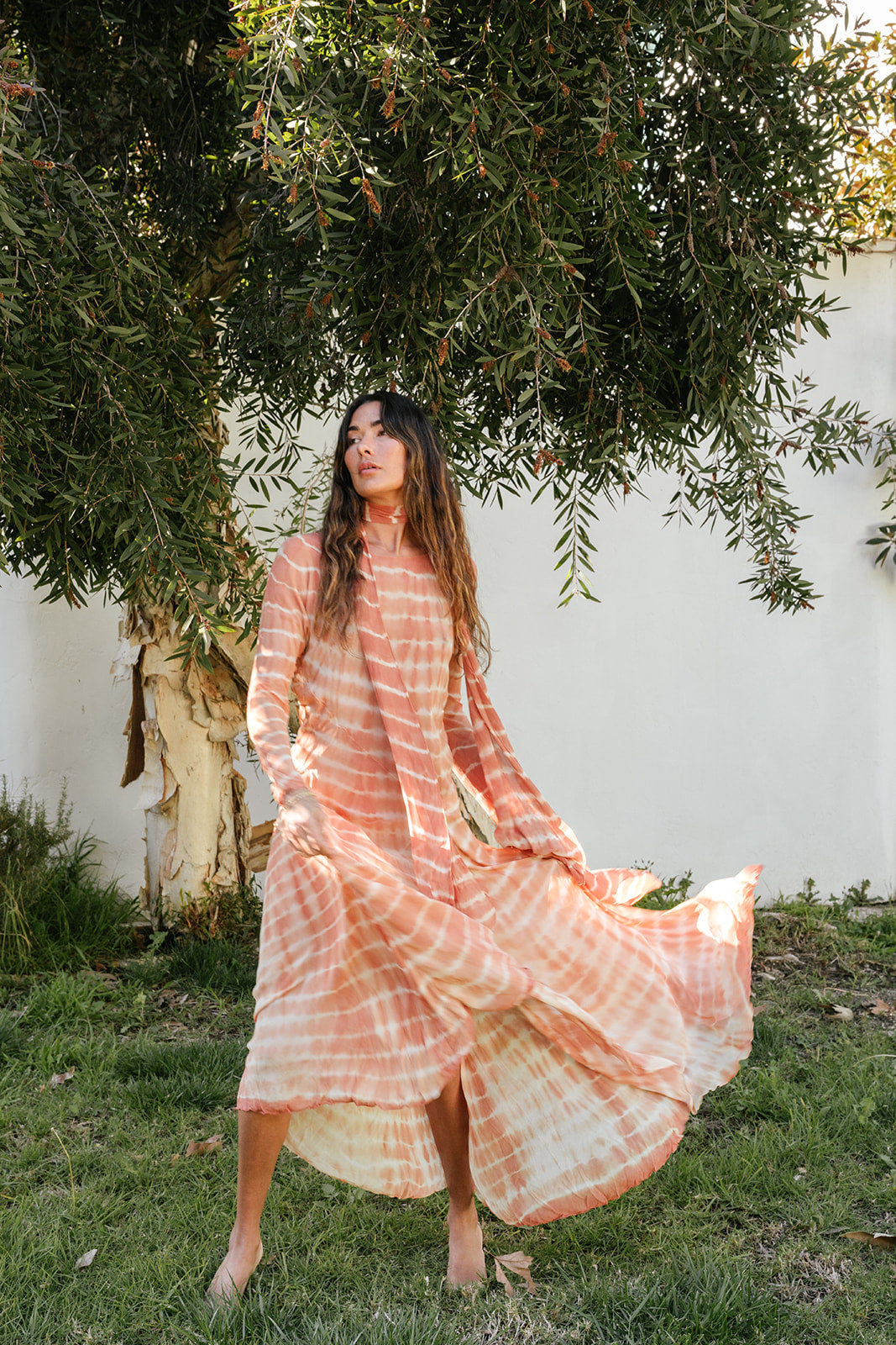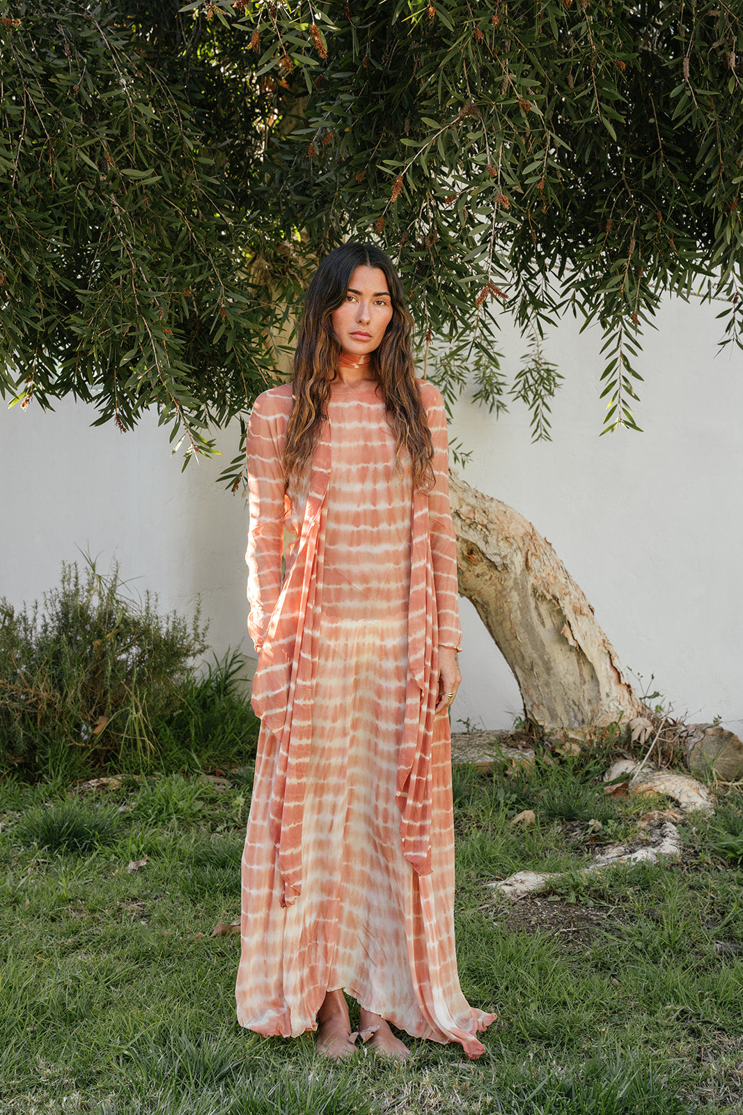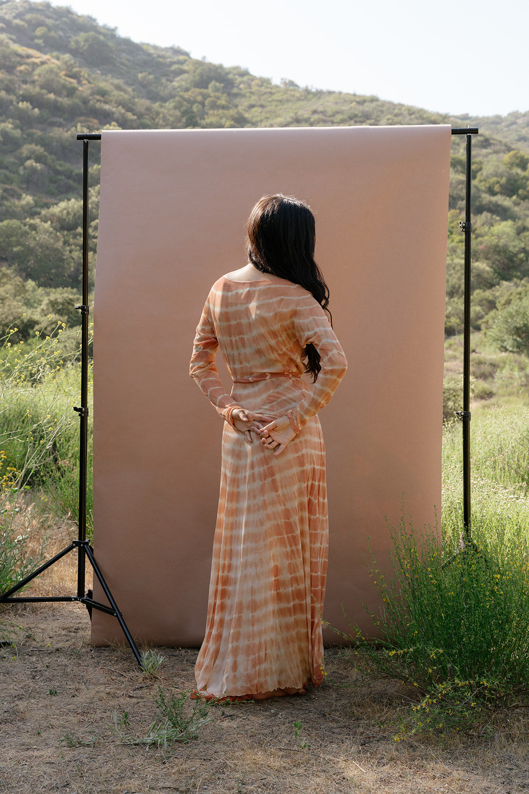 Pictured in "Papaya Tie Dye" these meters of hand dyed, tie-dyed pure silk chiffon with tropical botanicals of with sappan bark, mango leaves, and sacred Balinese flowers and it's an absolute one of a kind dream piece. Like all of our garments, this one is hand sewn by a small workshop in Bali after being dyed by artisans using only plant materials. We made a limited run of these and not sure when we can do this style again, especially in this color.