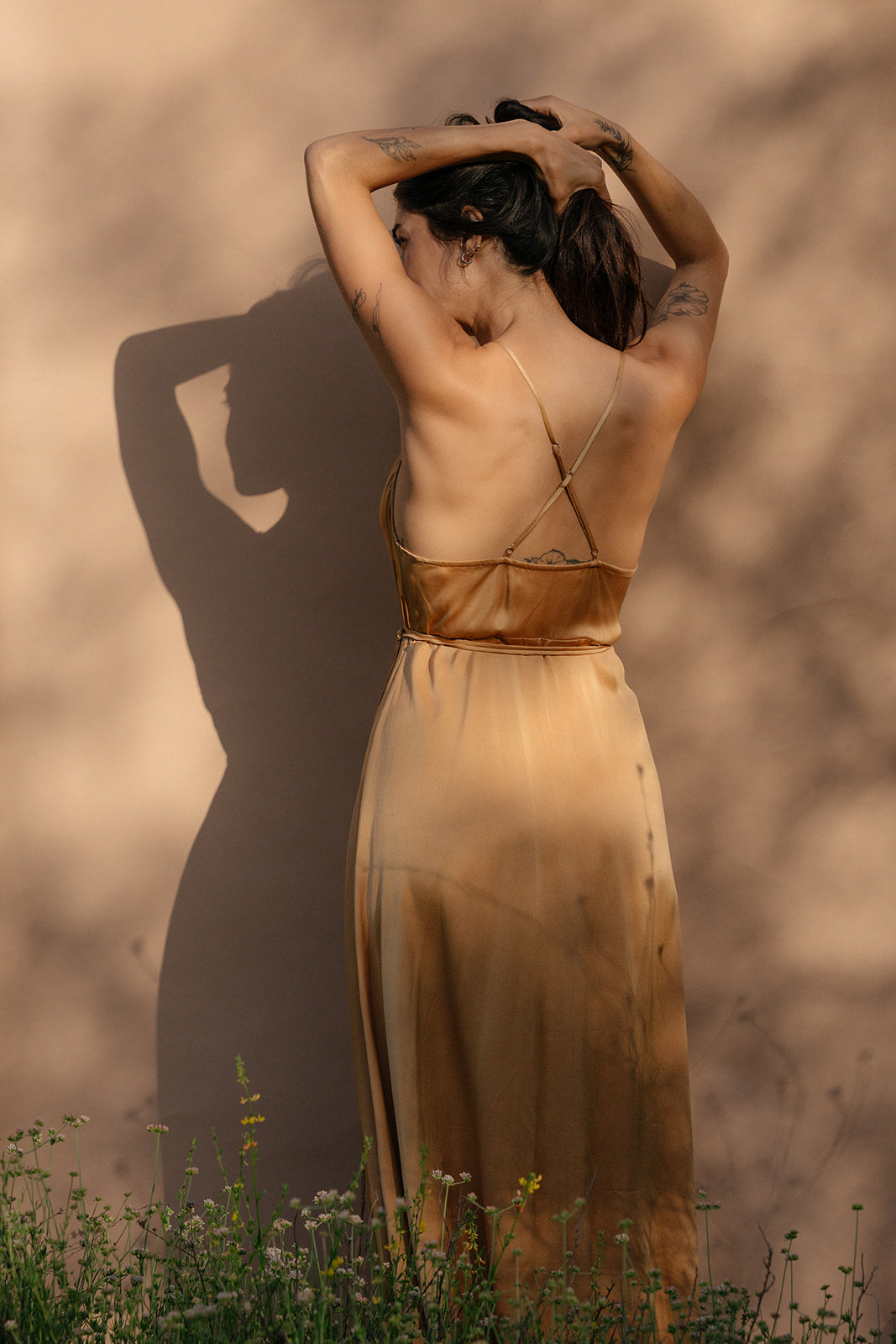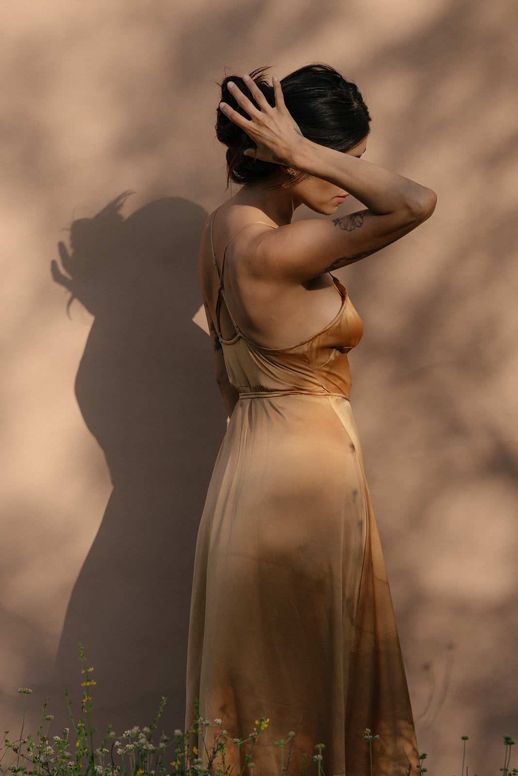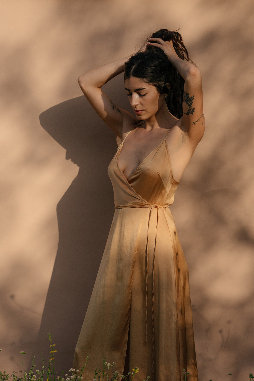 Pictured in Ancient Clay this top is hand dyed with mango and mahogany leaves and sacred Balinese flowers.