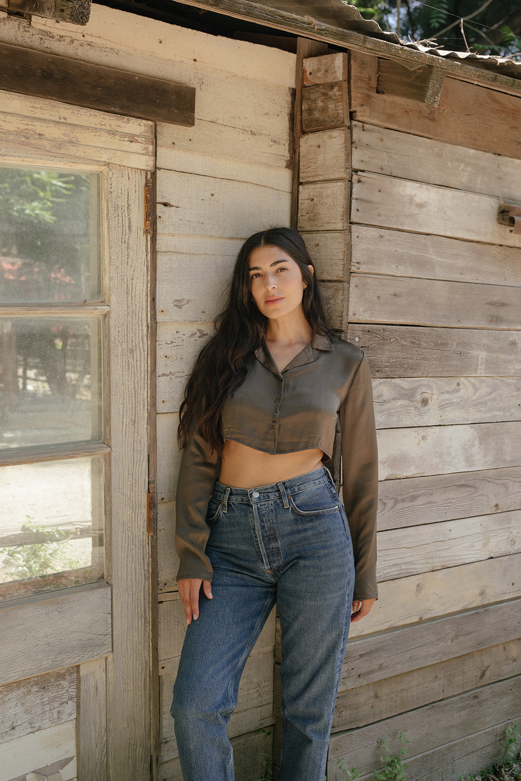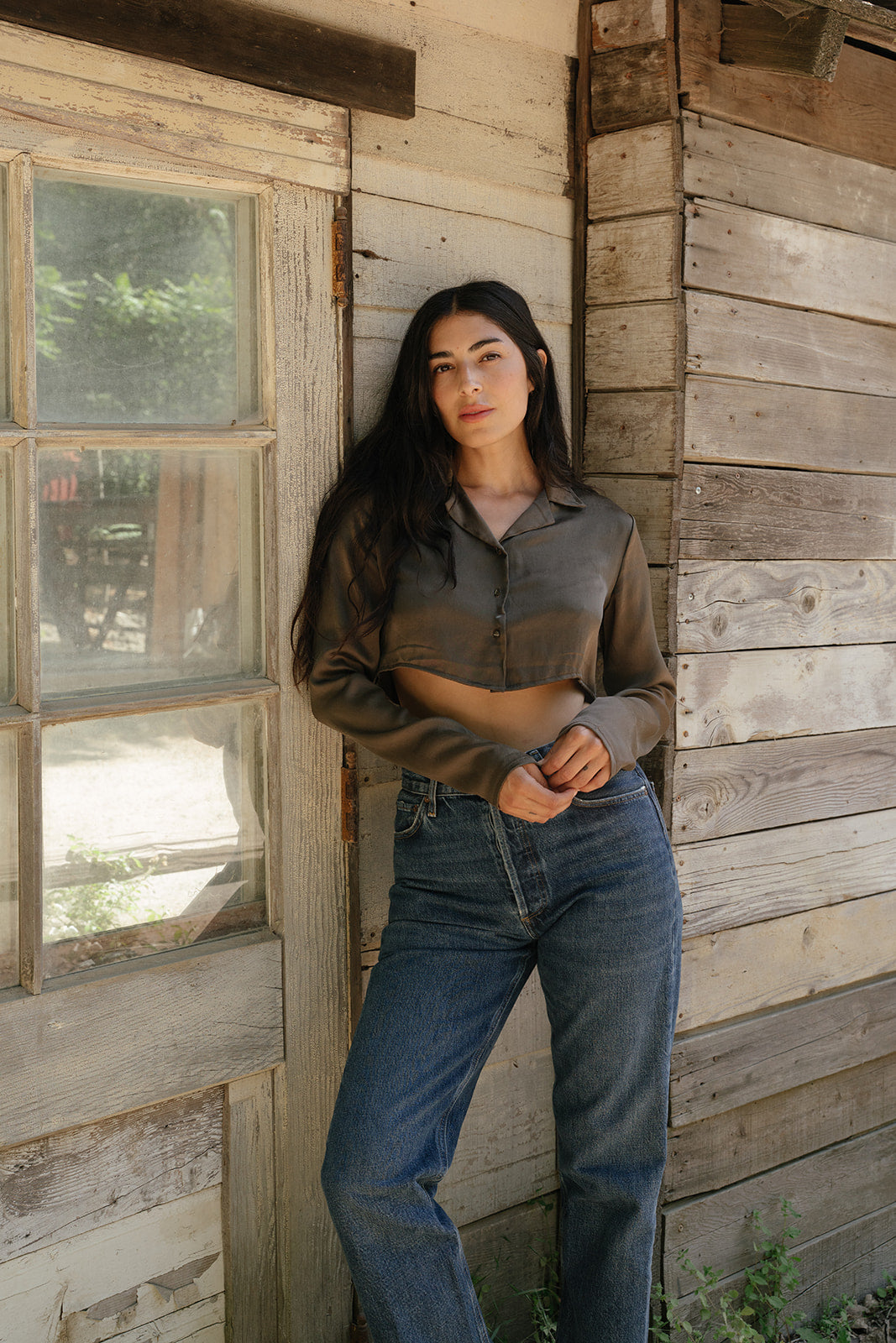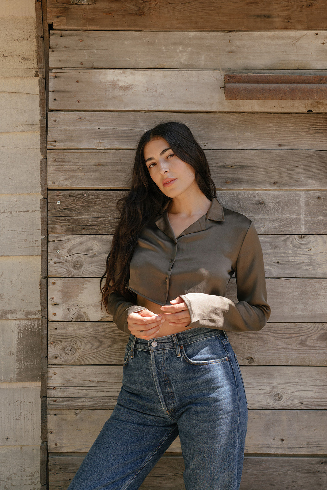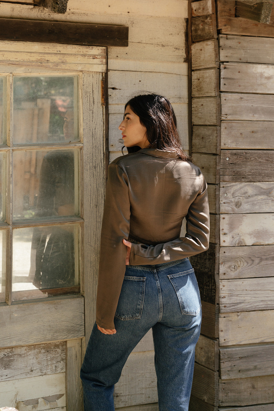 A sleek, elegant abalone shell buttoned cropped jacket. Wear it over your favorite slip or show a little midriff and pair it with a skirt or high-waist pants.