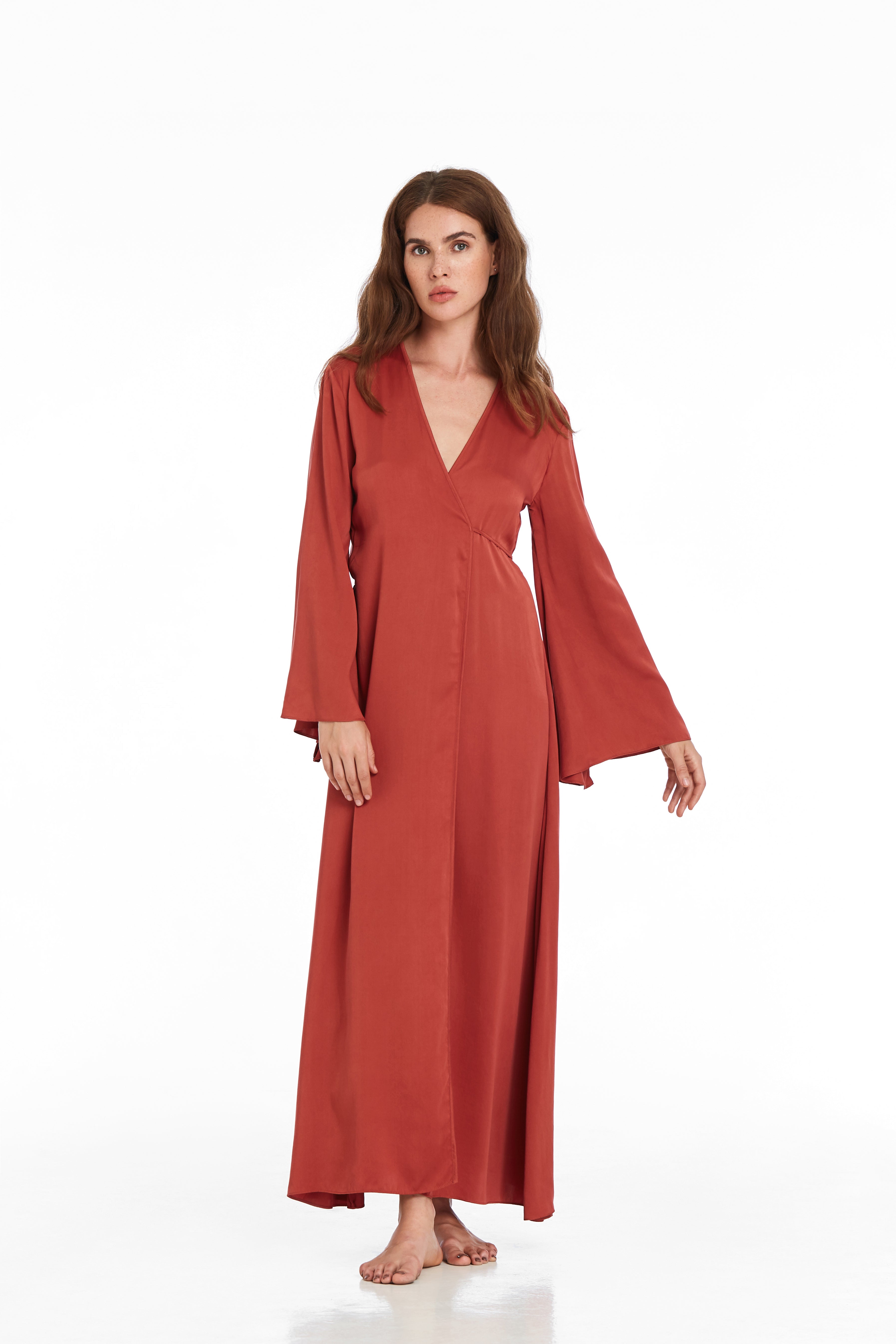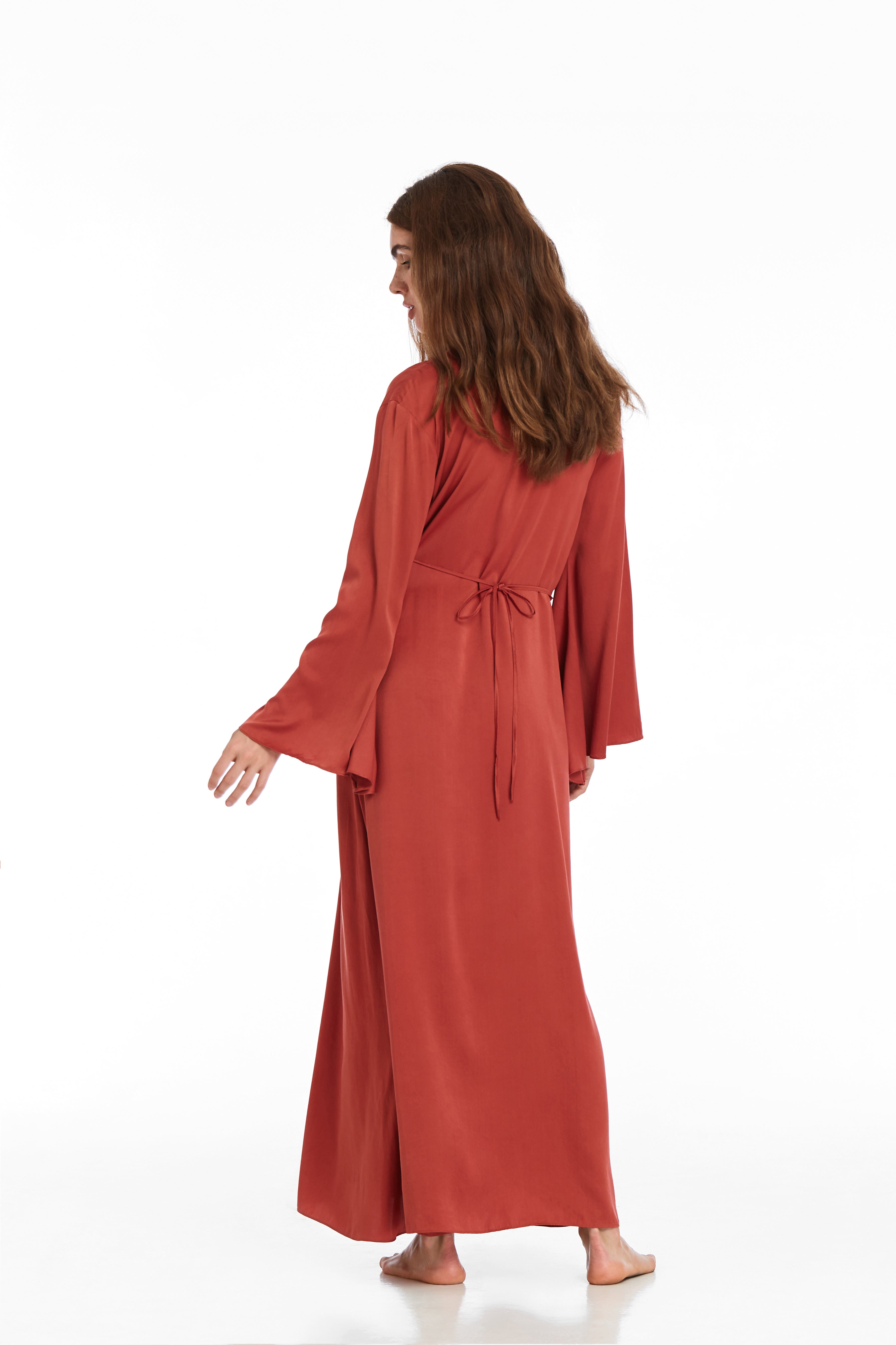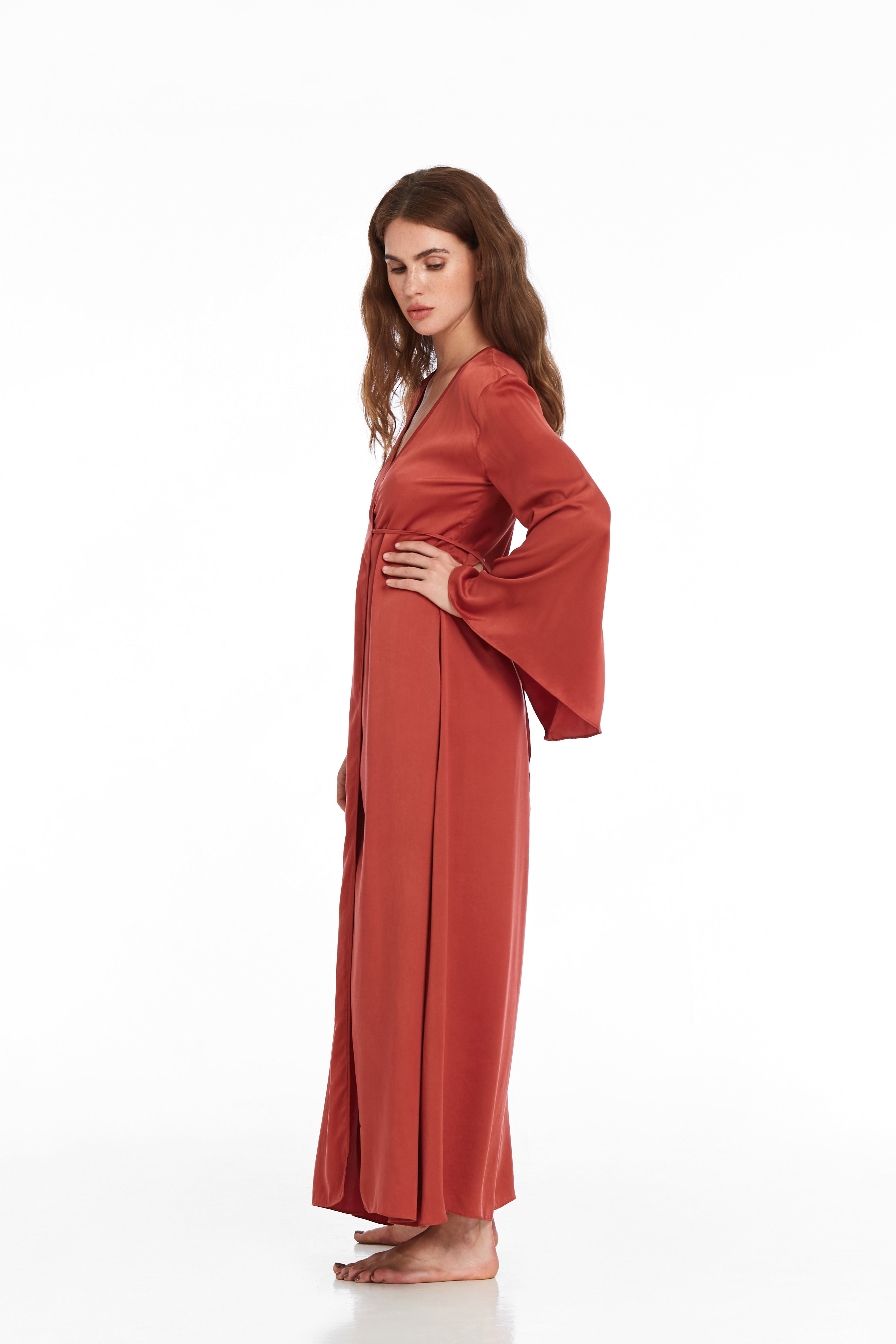 Flowing robe with lily sleeves. Tie to wrap at waist or in front for a looser, dramatic robe effect. Wear alone as a dress, belted or as layering piece with your favorite slip.
