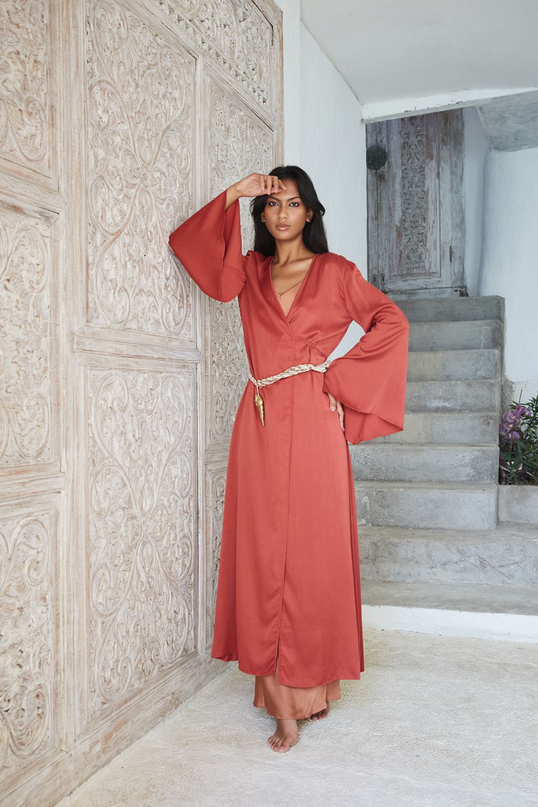 Pictured in Ember Red, hand dyed with sappan bark, coconut husks and sacred Balinese flowers.